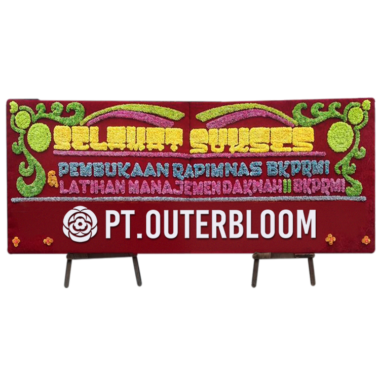 Papan Bunga Untuk Ucapan Selamat Desain Terbaik dengan Rangkaian Bunga Suyok Terbuat dari Styrofoam dan Busa Hadir dengan Rangka Penyangga yang Kuat Ukuran 400 cm x 125 cm Bisa Custom Untuk Penulisan Nama dan Ucapan Untuk Disewakan Selama 1-2 Hari