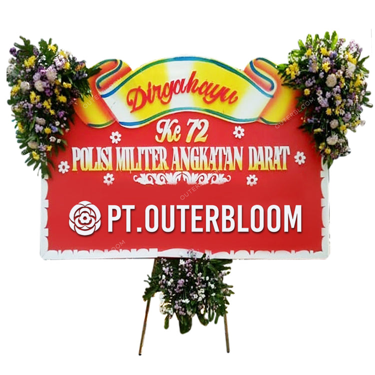 Papan Bunga untuk Ucapan Selamat Desain Terbaik dengan Rangkaian Bunga Suyok Terbuat dari Styrofoam dan Busa Hadir dengan Rangka Penyangga yang Kuat Ukuran 225 cm x 140 cm Bisa Custom untuk Penulisan Nama dan Ucapan