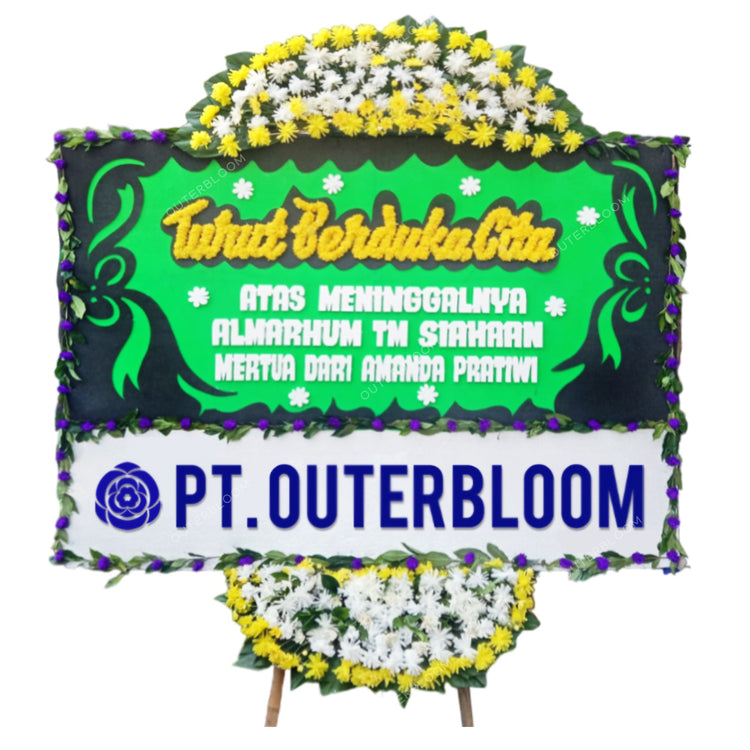 Papan Bunga Untuk Ucapan Duka Cita Desain Terbaik dengan Rangkaian Bunga Fresh, Bunga Suyok dan Styrofoam Hadir dengan Rangka Penyangga yang Kuat Ukuran 200 cm x 125 cm Bisa Custom Untuk Penulisan Nama dan Ucapan