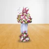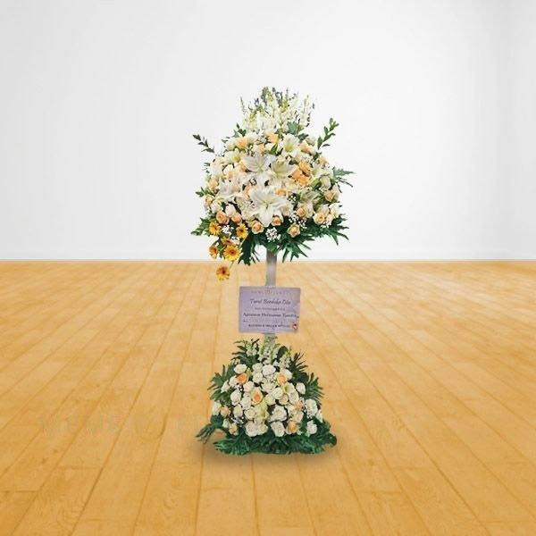 Standing flower cantik dengan kombinasi bunga utama terdiri dari bunga mawar, gerbera, lily cassablanca, dan babybreath dengan tampilan yang cantik dan elegan