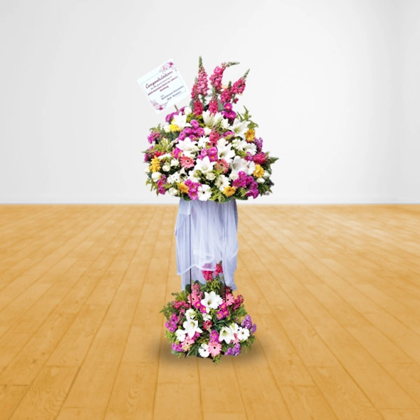 • Standing flower cantik dengan kombinasi bunga utama terdiri dari bunga mawar, gerbera, lily cassablanca, dan babybreath dengan tampilan yang cantik dan elegan