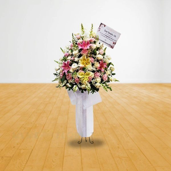 • Standing flower cantik dengan kombinasi bunga utama terdiri dari bunga mawar, gerbera, lily cassablanca, dan babybreath dengan tampilan yang cantik dan elegan