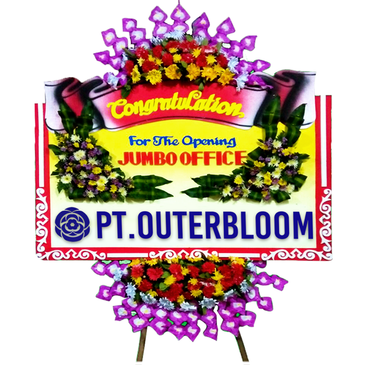 Papan Bunga untuk Ucapan Selamat Desain Terbaik dengan Rangkaian Bunga Fresh Berwarna Cerah Dilengkapi dengan Bunga Suyok Artificial Berkualitas Terbuat dari Styrofoam dan Busa Pilihan Hadir dengan Rangka Penyangga yang Kuat Ukuran 125 cm x 200 cm Bisa Custom untuk Penulisan Nama dan Ucapan
