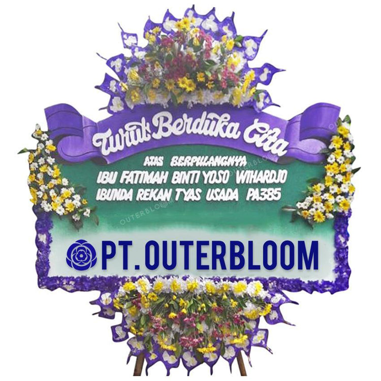 Papan Bunga untuk Ucapan Duka Cita Desain Terbaik dengan Rangkaian Bunga Fresh dan Suyok (Artificial) Terbuat dari Styrofoam dan Rangka Penyangga yang Kuat Ukuran 200 cm x 125 cm Bisa Custom Untuk Penulisan Nama dan Ucapan