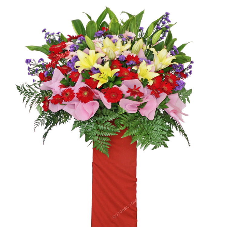 Perpaduan Sempurna dari Gerbera Merah, Gerbera Pink, Pikok Ungu, Lily, Daun Andong, Ruskus, dan Pakis