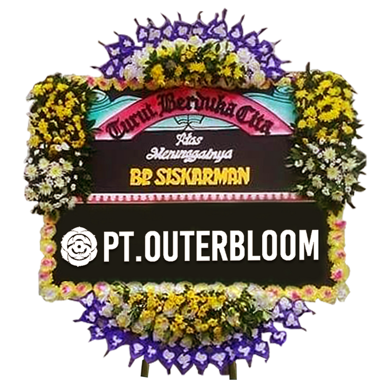 Papan Bunga untuk Ucapan Duka Cita Ukuran 125 cm x 200 cm Desain Terbaik dengan Rangkaian Bunga Fresh dan Bunga Suyok Berkualitas Terbuat dari Styrofoam dan Rangka Penyangga yang Kuat Bisa Custom untuk Penulisan Nama dan Ucapan