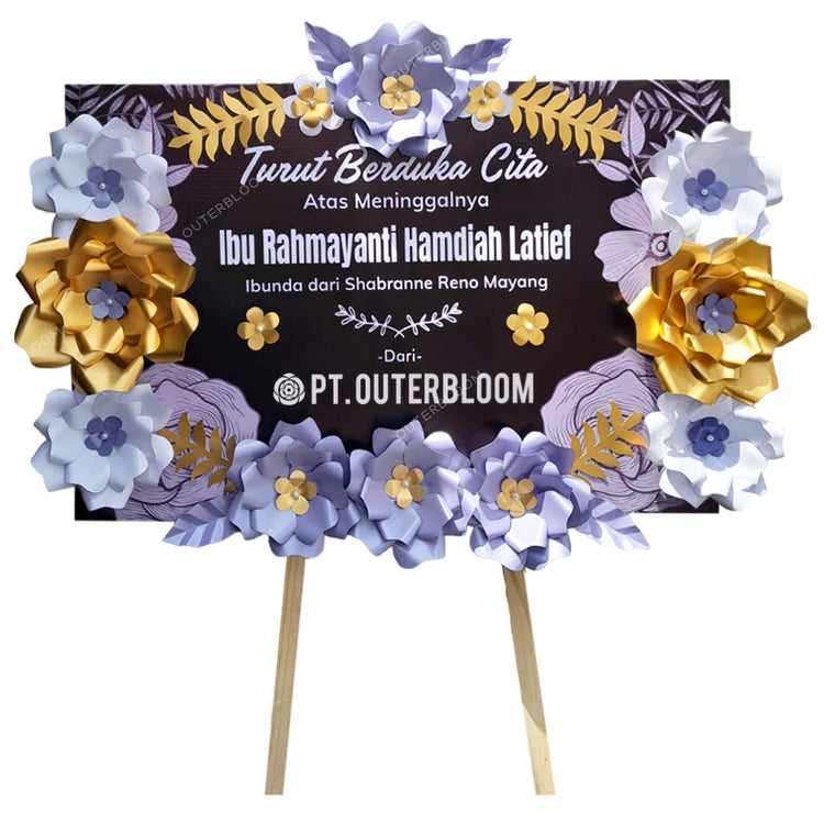 Desain Latar Papan Berwarna Ungu dengan Ilustrasi Floral; dan Karangan Bunga Kertas Berwarna Ungu dan Emas