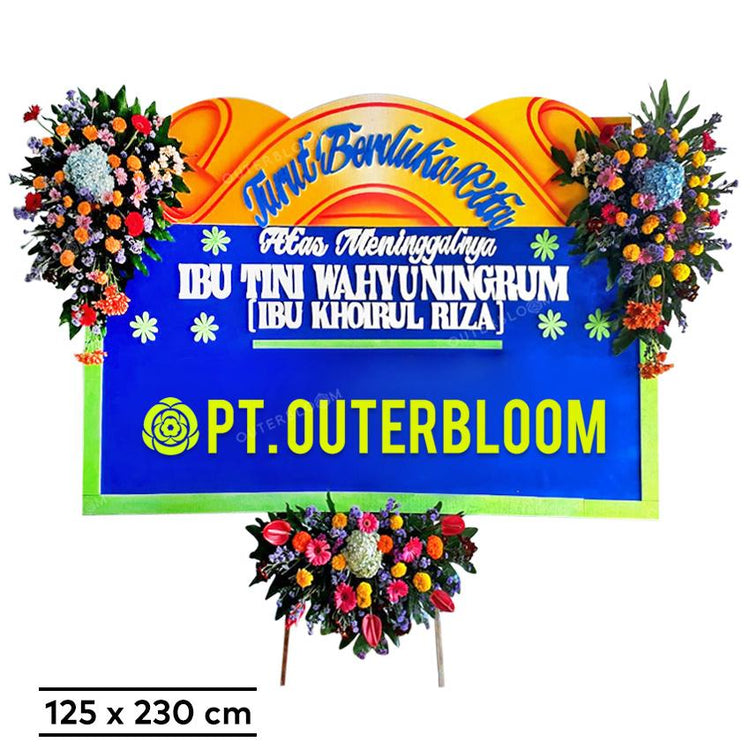 Papan Bunga Untuk Ucapan Duka Cita Desain Terbaik dengan Rangkaian Bunga Fresh dan Bunga Suyok Terbuat dari Styrofoam dan Rangka Penyangga yang Kuat Ukuran 230 cm x 125 cm Bisa Custom Untuk Penulisan Nama dan Ucapan