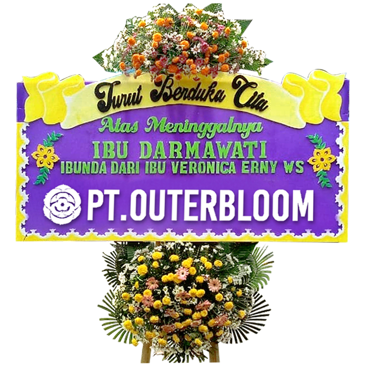 Papan Bunga Untuk Ucapan Duka Cita Desain Terbaik dengan Rangkaian Bunga Fresh, Bunga Suyok, dan Styrofoam Hadir dengan Rangka Penyangga yang Kuat Ukuran 100 cm x 200 cm Bisa Custom Untuk Penulisan Nama dan Ucapan