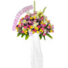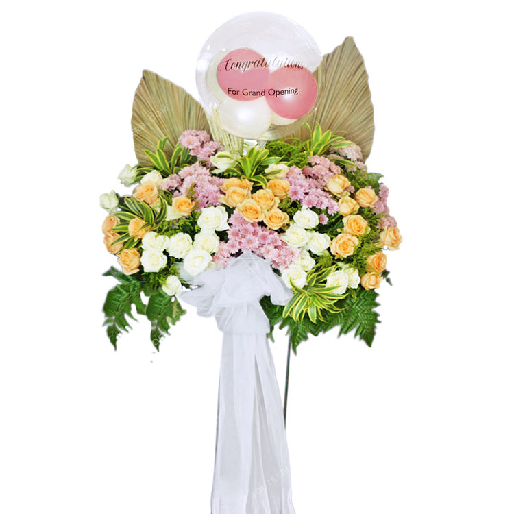 Dirangkai Indah dalam Standing Vase yang Dibalut dengan Kain Tule dan Dihias dengan Balon Tulisan “Congratulations for Grand Opening” atau Styrofoam Tulisan “Selamat & Sukses”
