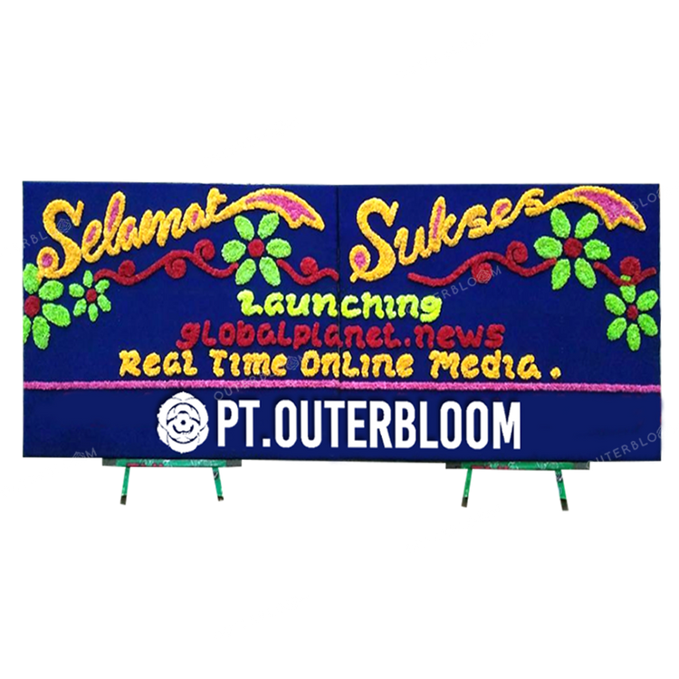 Papan Bunga untuk Ucapan Selamat Desain Terbaik dengan Rangkaian Bunga Suyok Terbuat dari Styrofoam dan Busa Hadir dengan Rangka Penyangga yang Kuat Ukuran 200 cm x 600 cm Bisa Custom untuk Penulisan Nama dan Ucapan Untuk Disewakan Selama 1-2 Hari