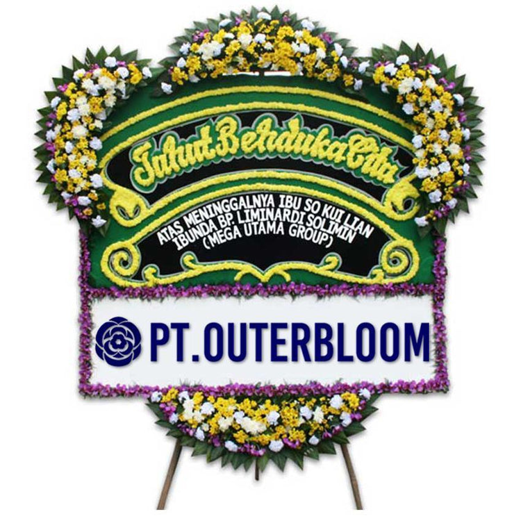 Papan Bunga Untuk Ucapan Duka Cita Desain Terbaik dengan Rangkaian Bunga Fresh, Bunga Suyok dan Styrofoam Hadir dengan Rangka Penyangga yang Kuat Ukuran 200 cm x 125 cm Bisa Custom Untuk Penulisan Nama dan Ucapan