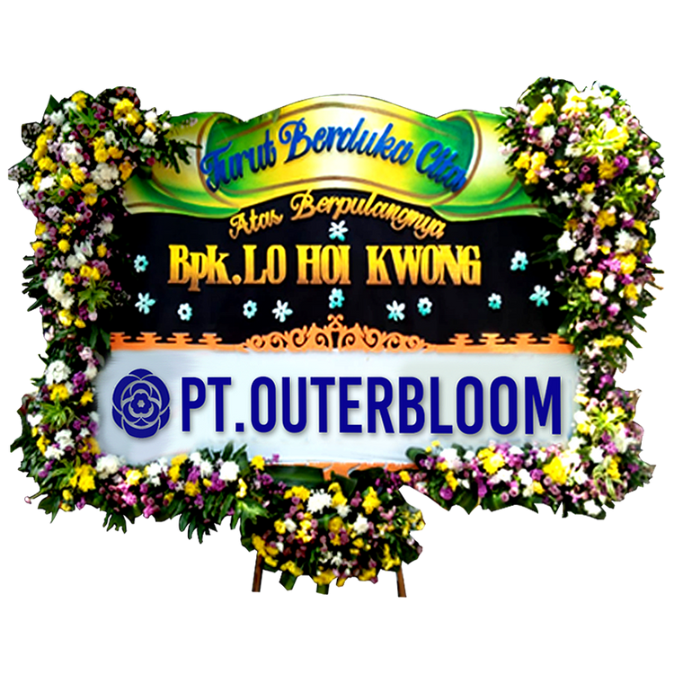 Papan Bunga untuk Ucapan Duka Cita Desain Terbaik dengan Rangkaian Bunga Fresh, Bunga Suyok dan Styrofoam Hadir dengan Rangka Penyangga yang Kuat Ukuran 225 cm x 140 cm Bisa Custom untuk Penulisan Nama dan Ucapan