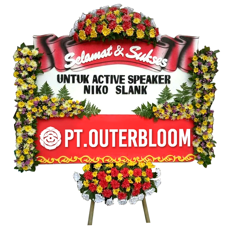 Papan Bunga untuk Ucapan Selamat Desain Terbaik dengan Rangkaian Bunga Fresh dan Bunga Suyok Artificial Warna Cantik Terbuat dari Styrofoam dan Busa Berkualitas Hadir dengan Rangka Penyangga yang Kokoh Ukuran 125 cm x 200 cm Bisa Custom untuk Penulisan Nama dan Ucapan