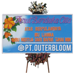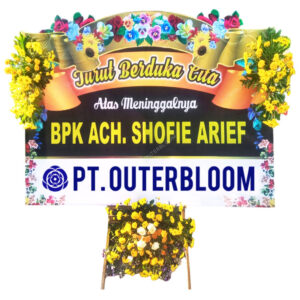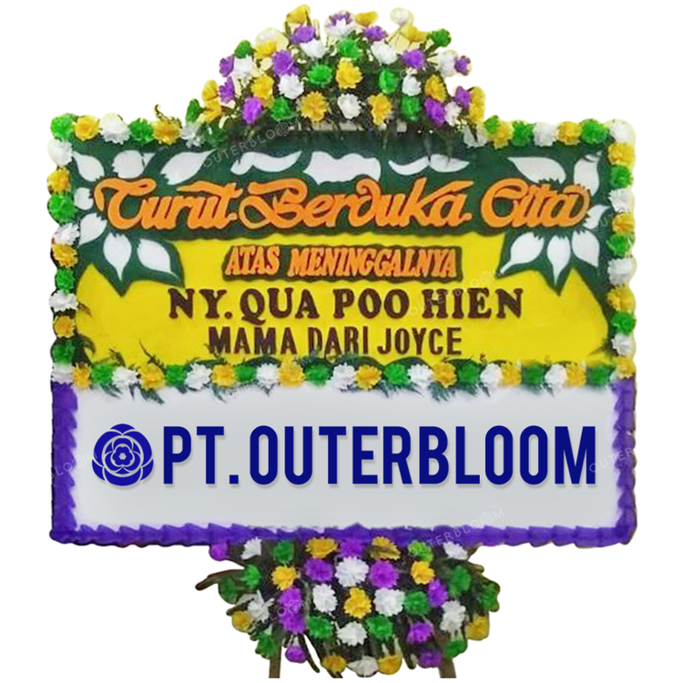 Papan Bunga Untuk Ucapan Duka Cita Desain Terbaik dengan Rangkaian Bunga Fresh, Bunga Suyok, dan Styrofoam Hadir dengan Rangka Penyangga yang Kuat Ukuran 200 cm x 150 cm Bisa Custom untuk Penulisan Nama dan Ucapan