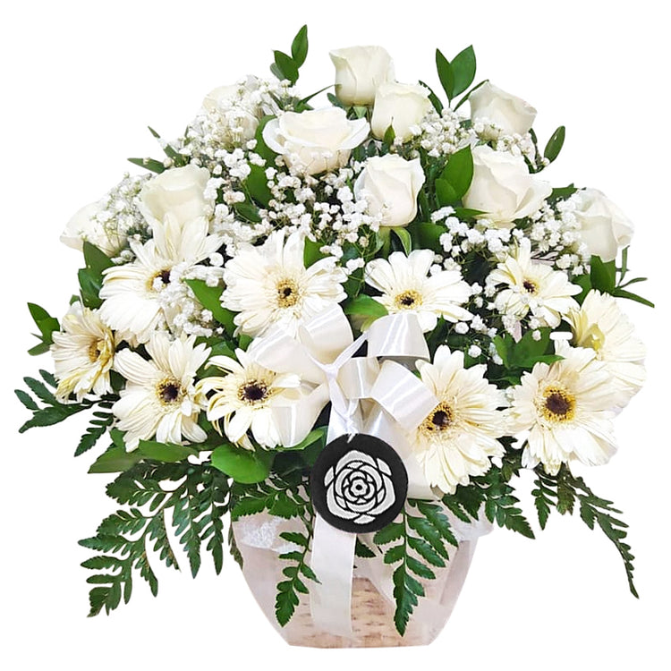 Rangkaian Mawar Putih, Krisan Putih, dan Baby Breath
